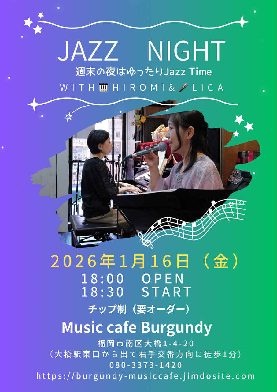 Music cafe Burgundy バーガンディ福岡県福岡市南区大橋1丁目 4-20 ロワールマンション大橋3 1F080-3373-1420 https://burgundy-musiccafe.jimdosite.com OPEN:15:00~21:00 定休日:火 未成年のみの入場制限なし 禁煙 駐車場なし 木曜喫茶営業(15:00〜21:00) 火曜以外は10:00〜23:00までの間で予約可 前日までにお問い合わせください 会場写真の1枚目に写っている 看板が出ていれば営業しています (ライブ、貸切の場合もあります) ライブ会場貸、スタジオ貸等行っております ホームページのご案内をご覧ください 飲食メニューについても 軽食、アルコール、コーヒー、紅茶、ソフトドリンク等 ホームページのご案内をご確認ください 発表会などの団体様につきましては 別途ご相談に応じますので、一度お問い合わせください |
