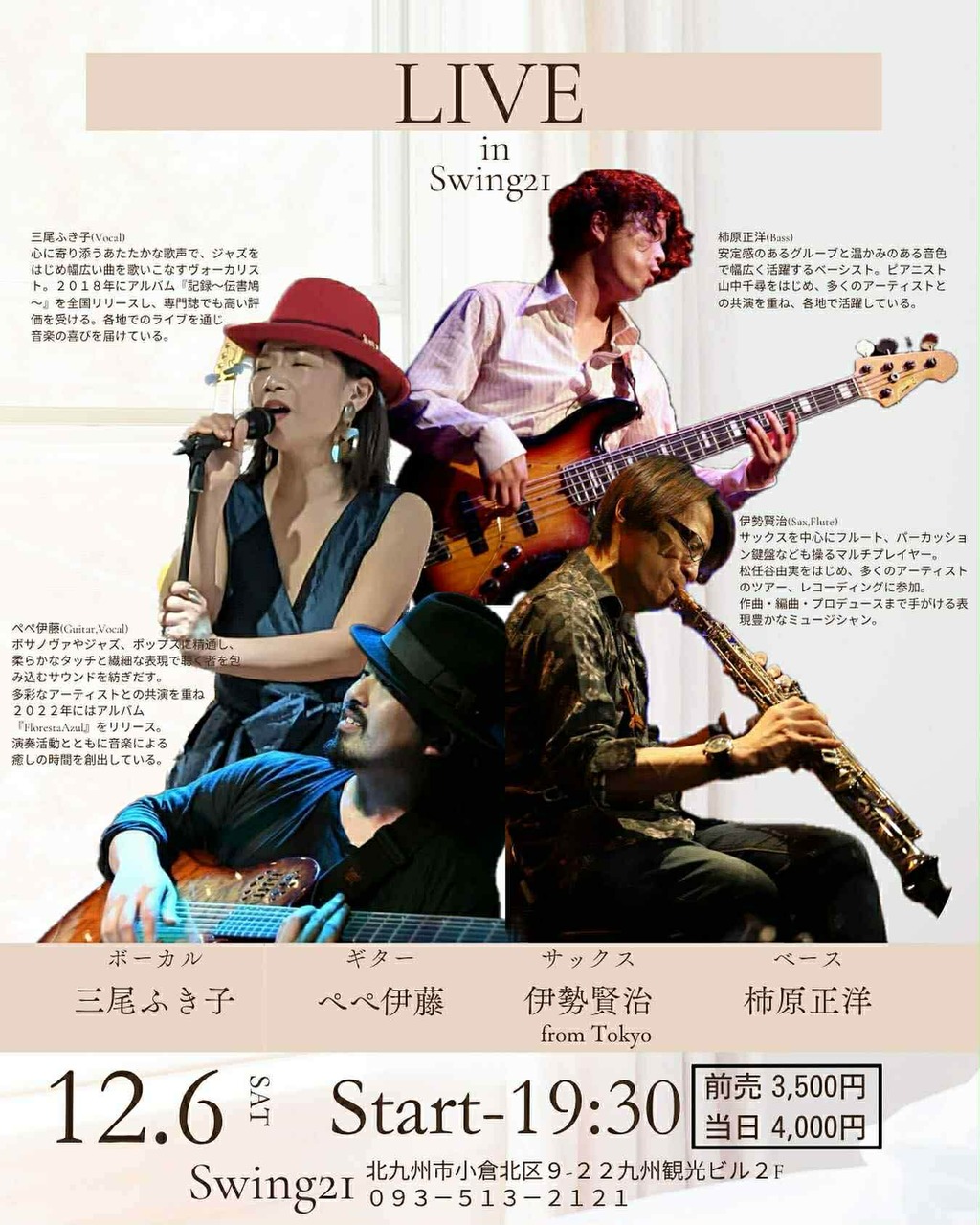 | 出演者 | 三尾ふき子(vo.) 柿原正洋(b.) 伊勢賢治(sax.) pepe伊藤(g.) |