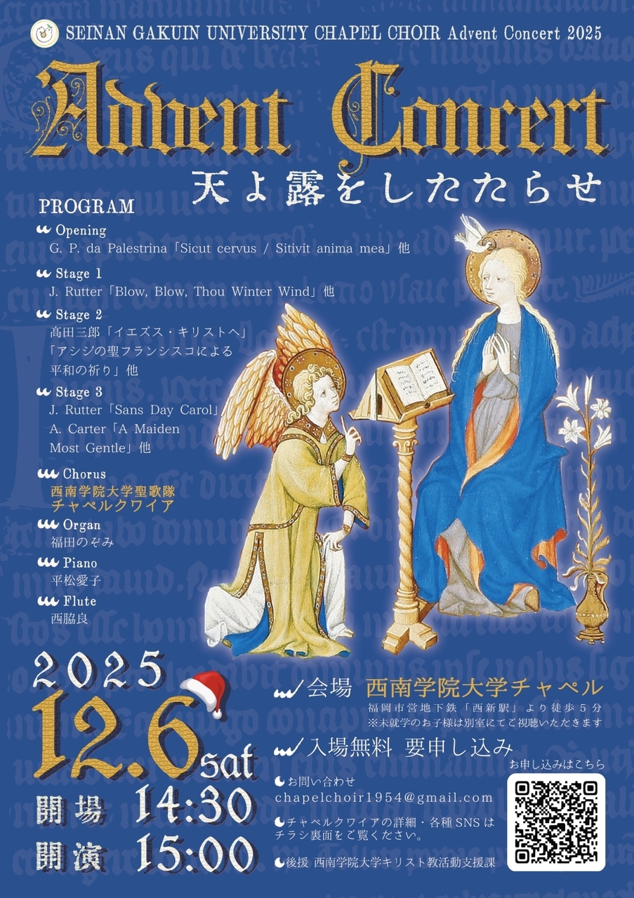 | イベント名 | 西南学院大学聖歌隊チャペルクワイア 2025年度 アドヴェントコンサート「天よ 露をしたたらせ」 |