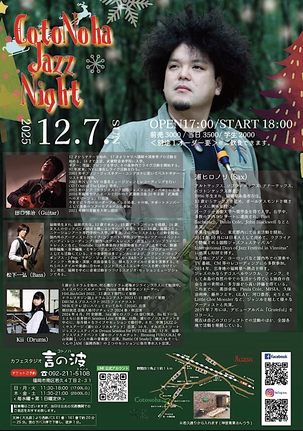 - 出 演 : 浦ヒロノリ(sax) 、田口悌治 (guitar) 、 松下一弘 (bass) 、 Kii (drums)