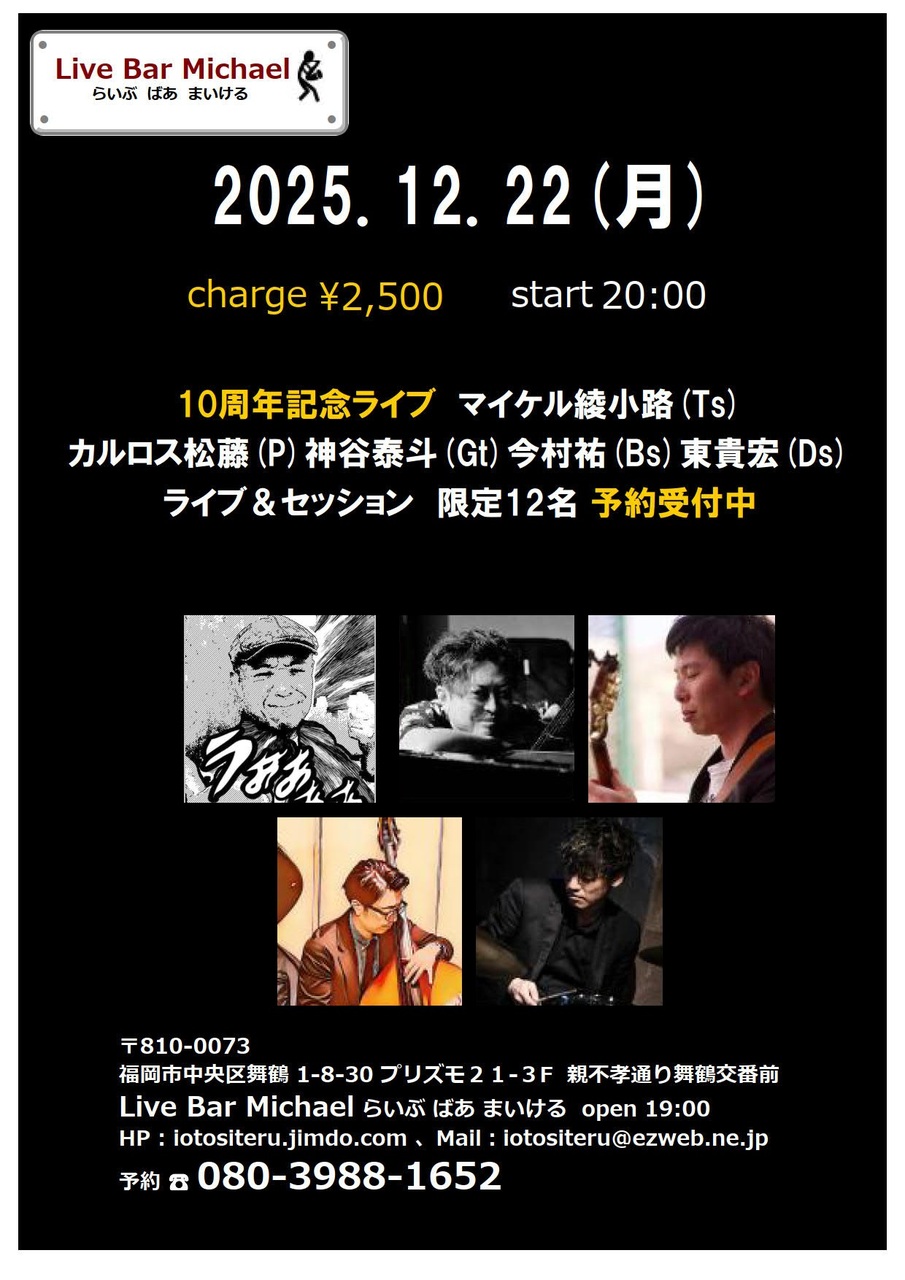 - 出 演 : 10周年記念ライブ マイケル綾小路(Ts)カルロス松藤((P)神谷泰斗(Gt)今村祐(Bs)東貴宏(Ds)ライブ&セッション2500円20:00スタート