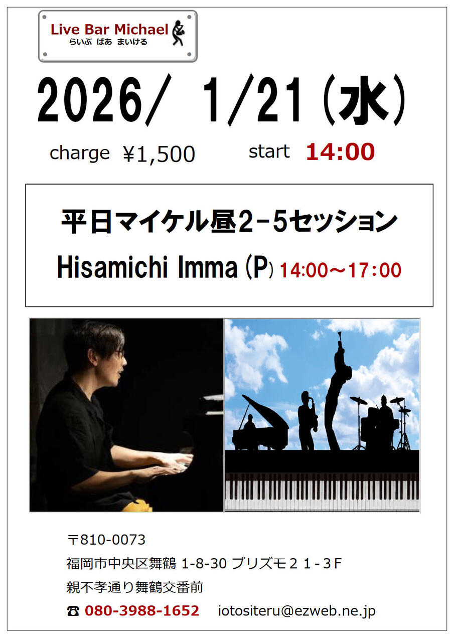 | 出演者 | 平日マイケル昼2-5セッション Hisamichi Imma(P)1500円14:00~17:00 |