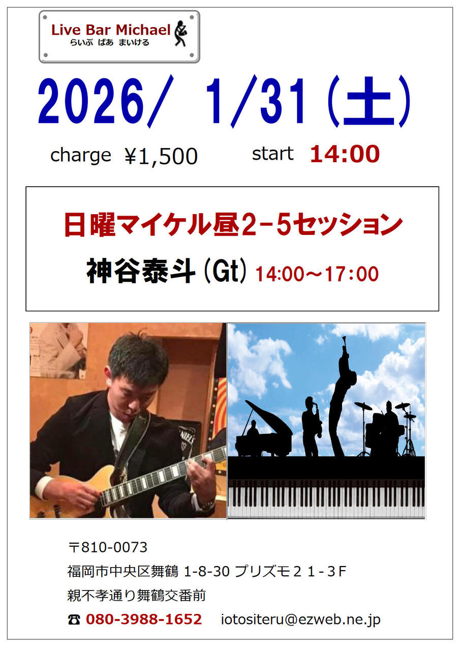 日曜マイケル昼2-5セッション神谷泰斗(Gt)1500円14:00~17:00