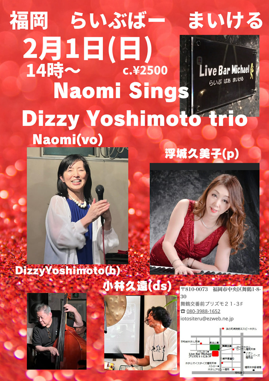 - 出 演 : Naomi(Vo)浮城久美子(P)DizzyYoshimoto(Bs)ジョニー小林(Ds)日曜昼ライブ&セッション2500円14:00~17:00