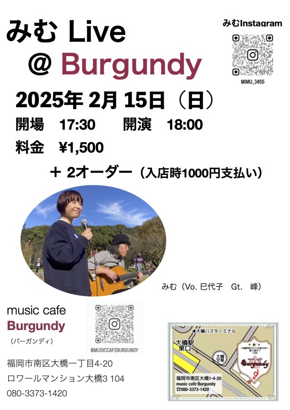 Music cafe Burgundy バーガンディ福岡県福岡市南区大橋1丁目 4-20 ロワールマンション大橋3 1F080-3373-1420 https://burgundy-musiccafe.jimdosite.com OPEN:15:00~21:00 定休日:火 未成年のみの入場制限なし 禁煙 駐車場なし 木曜喫茶営業(15:00〜21:00) 火曜以外は10:00〜23:00までの間で予約可 前日までにお問い合わせください 会場写真の1枚目に写っている 看板が出ていれば営業しています (ライブ、貸切の場合もあります) ライブ会場貸、スタジオ貸等行っております ホームページのご案内をご覧ください 飲食メニューについても 軽食、アルコール、コーヒー、紅茶、ソフトドリンク等 ホームページのご案内をご確認ください 発表会などの団体様につきましては 別途ご相談に応じますので、一度お問い合わせください |