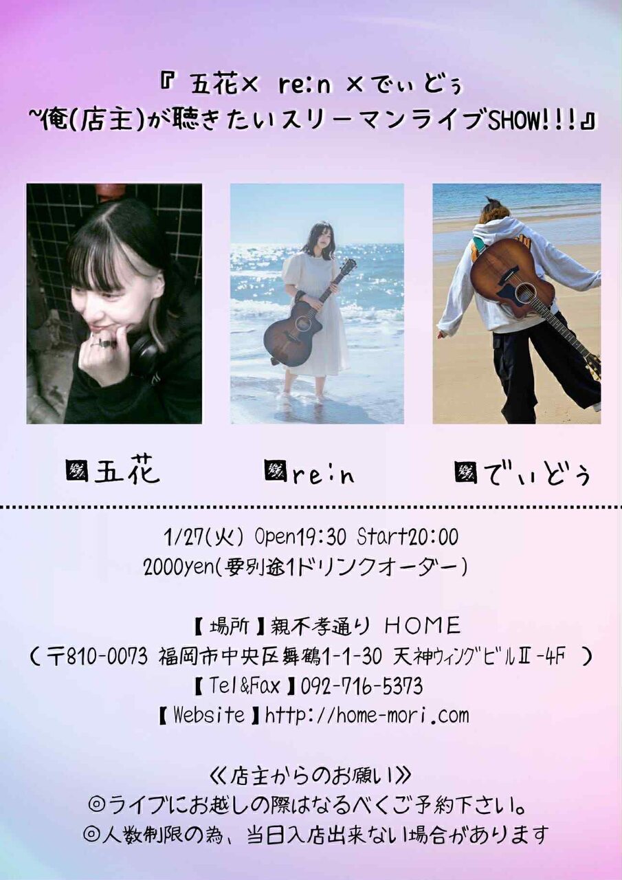 | イベント名 | 五花× re:n ×でぃどぅ~俺(店主)が聴きたいスリーマンライブSHOW!!! |