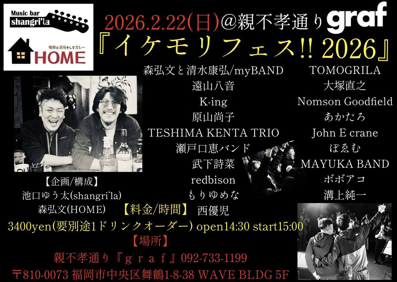 | 出演者 | 森弘文と清水康弘/myBAND ぽゑむ 西優児 もりゆめな John E crane 原山尚子 Nomson Goodfield 溝上純一 TESHIMA KENTA TRIO あかたろ ボボアコ 武下詩菜 MAYUKA BAND K-ing TOMOGRILA 遠山八音 瀬戸口恵バンド 大塚直之 redbison/myBAND |