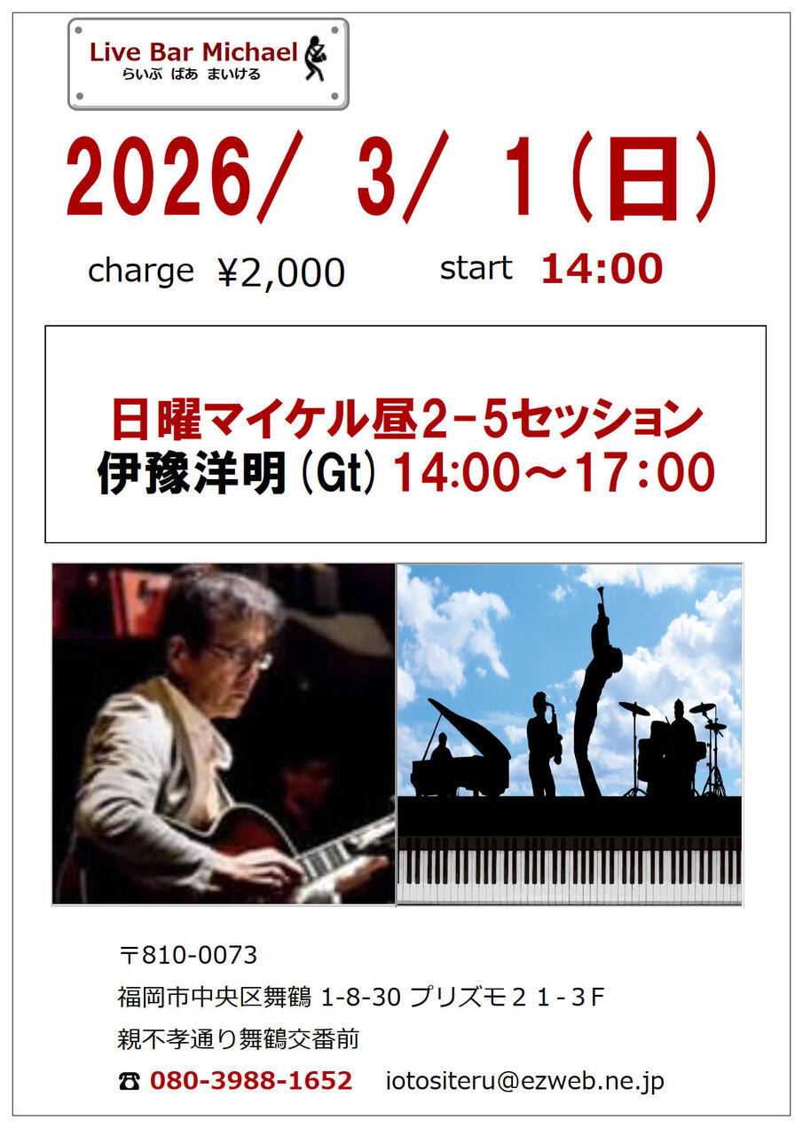 日曜マイケル昼2-5セッション伊豫洋明(Gt)2000円14:00~17:00