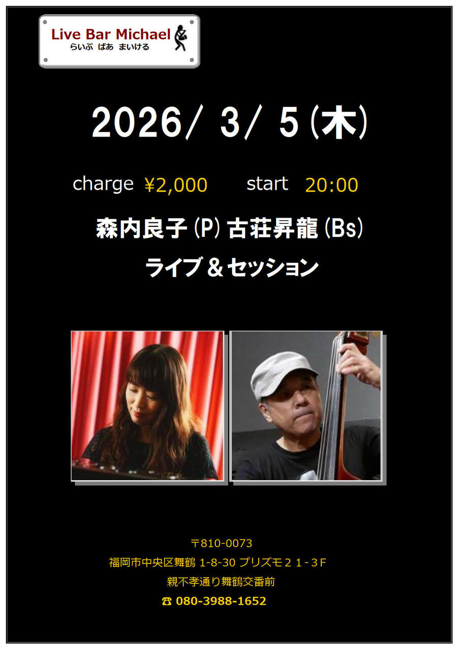 - 出 演 : 森内良子(P)古荘昇龍(Bs)ライブ&セッション2000円20:00スタート
