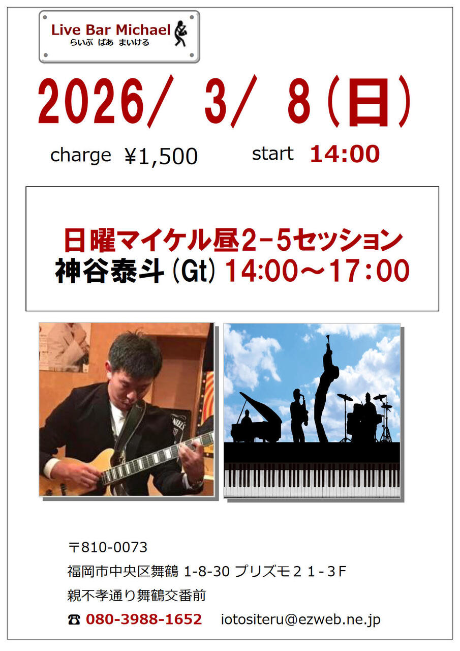日曜マイケル昼2-5セッション神谷泰斗(Gt)1500円14:00~17:00