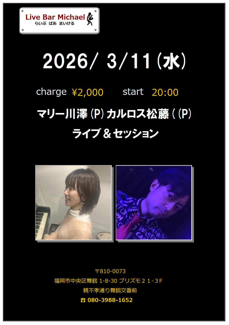 - 出 演 : マリー川澤(P)カルロス松藤((P)ライブ&セッション2000円20:00スタート