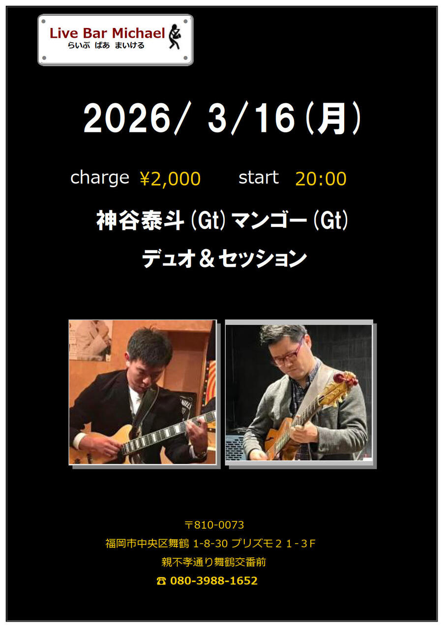 - 出 演 : 神谷泰斗(Gt)マンゴー(Gt)ライブ&セッション2000円20:00スタート