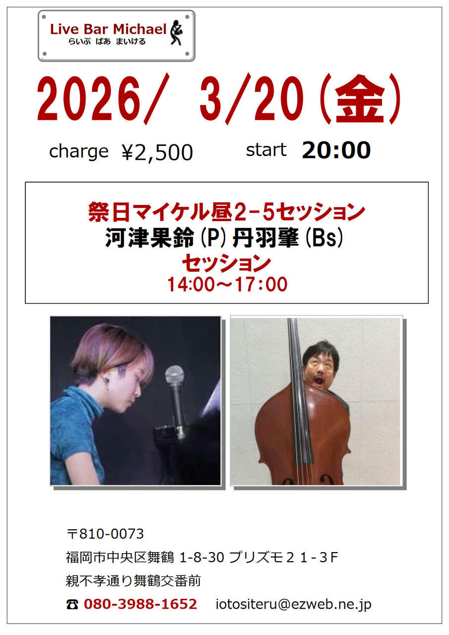 | 出演者 | 祭日マイケル昼2-5セッション河津果鈴(P)丹羽肇(Bs)ライブ&セッション2500円14:00~17:00 |