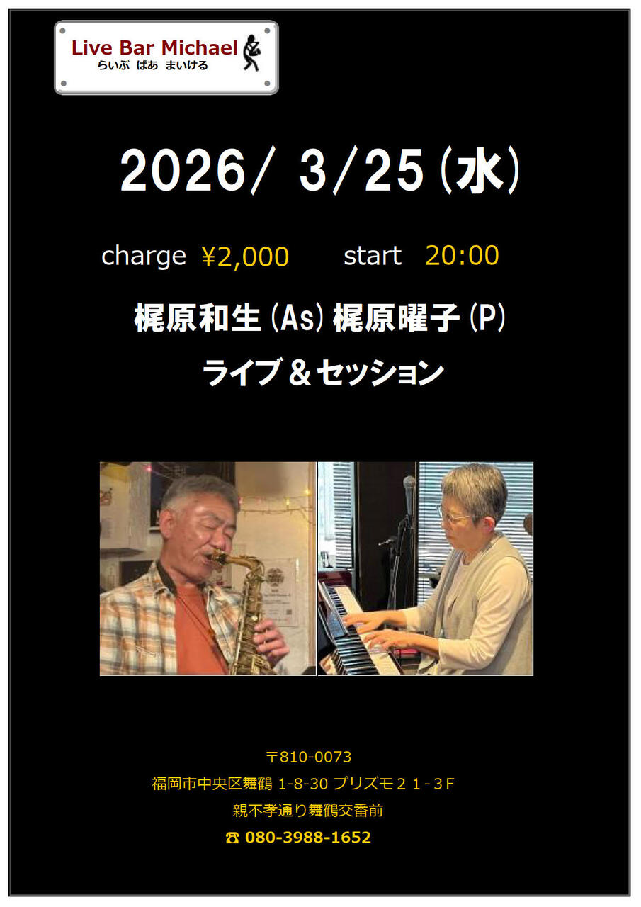 | 出演者 | 梶原和生(As)梶原曜子(P)ライブ&セッション2000円20:00スタート |