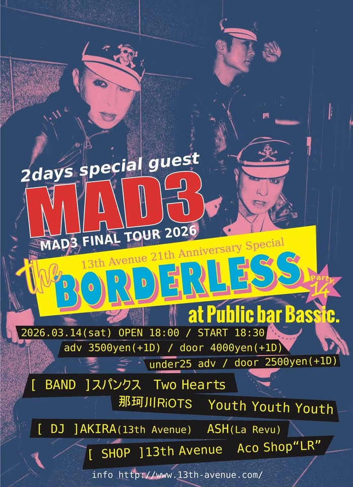 | 出演者 | MAD3 CAST スパンクス 那珂川RiOTS Two Hearts Youth Youth Youth DJ :AKIRA(13th Avenue) ASH(La Revu) SHOP 13th Avenue Aco Shop"LR" |