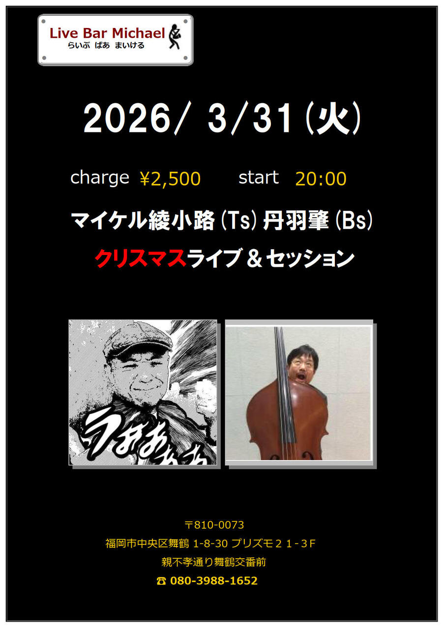 - 出 演 : マイケル綾小路(Ts)丹羽肇(Bs)ライブ&セッション2500円20:00スタート