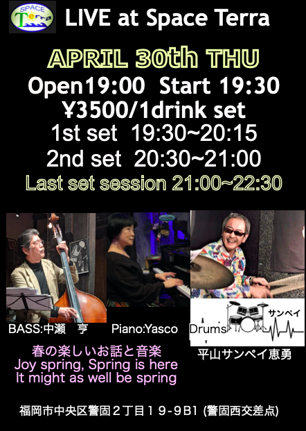 - 出 演 : Drums:平山サンペイ恵勇, . Bass:中瀬 亨 pf:YASCO