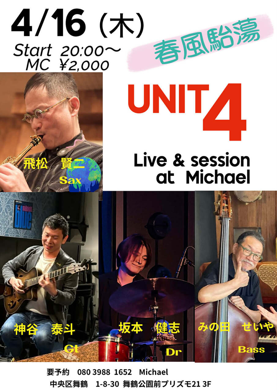 - 出 演 : 飛松賢二(Ts)神谷泰斗(Gt)みの田せいや(Bs)坂本健志(Ds/P)ライブ&セッション2000円20:00スタート