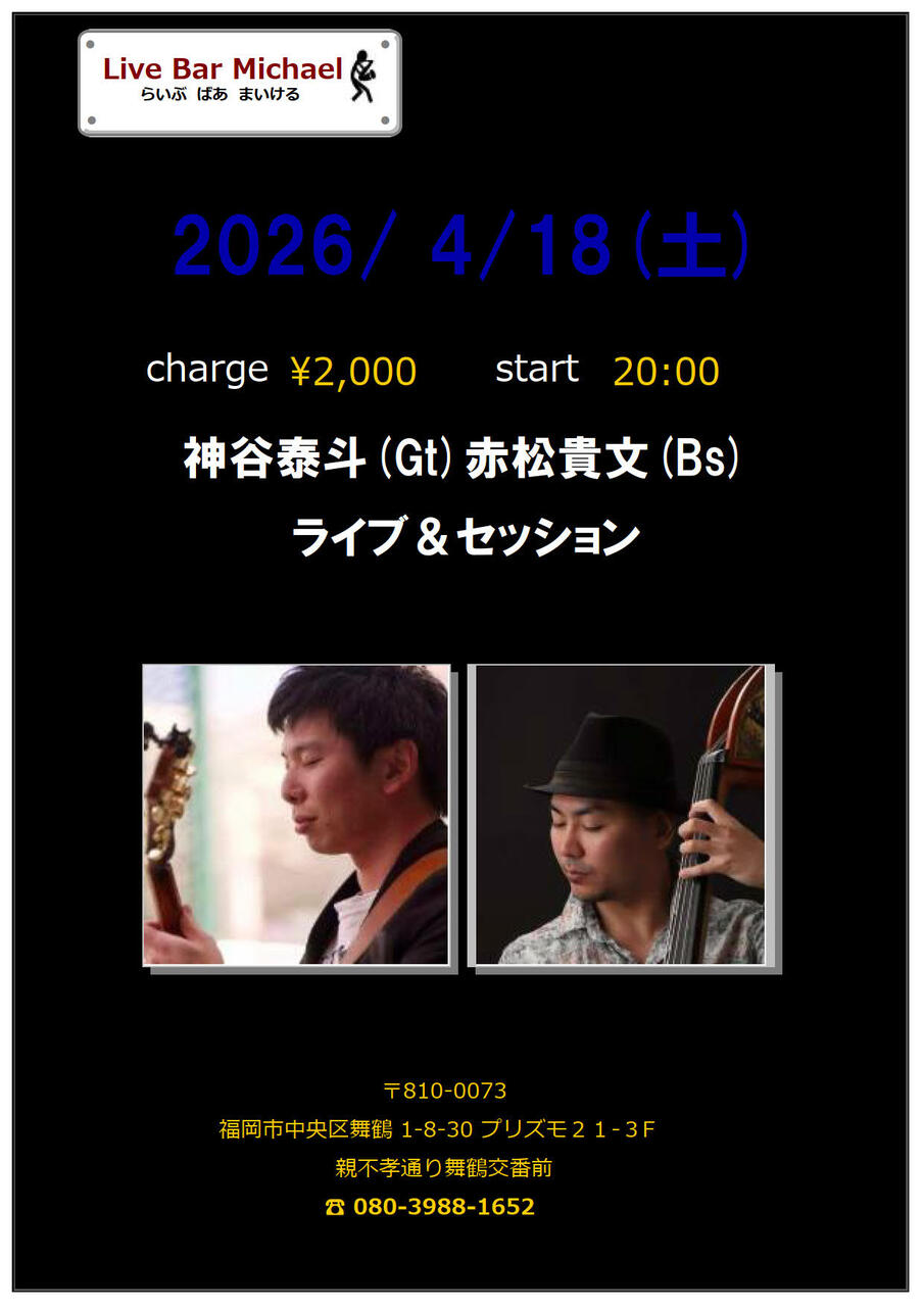 - 出 演 : 神谷泰斗(Gt)赤松貴文(Bs)ライブ&セッション2000円20:00スタート