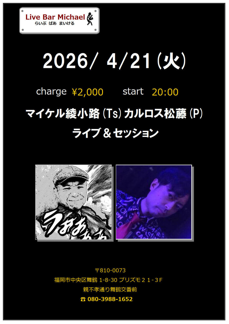 - 出 演 : マイケル綾小路(Ts)カルロス松藤((P)ライブ&セッション2000円20:00スタート