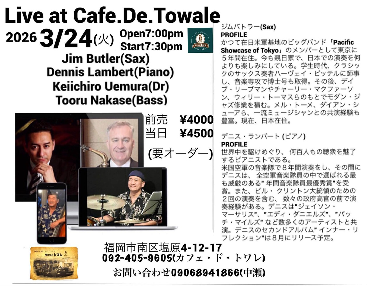 | 出演者 | Jim Butler(sax.) Dennis Lambert(pf.) 中瀬亨(b.) 上村計一郎(dr.) |