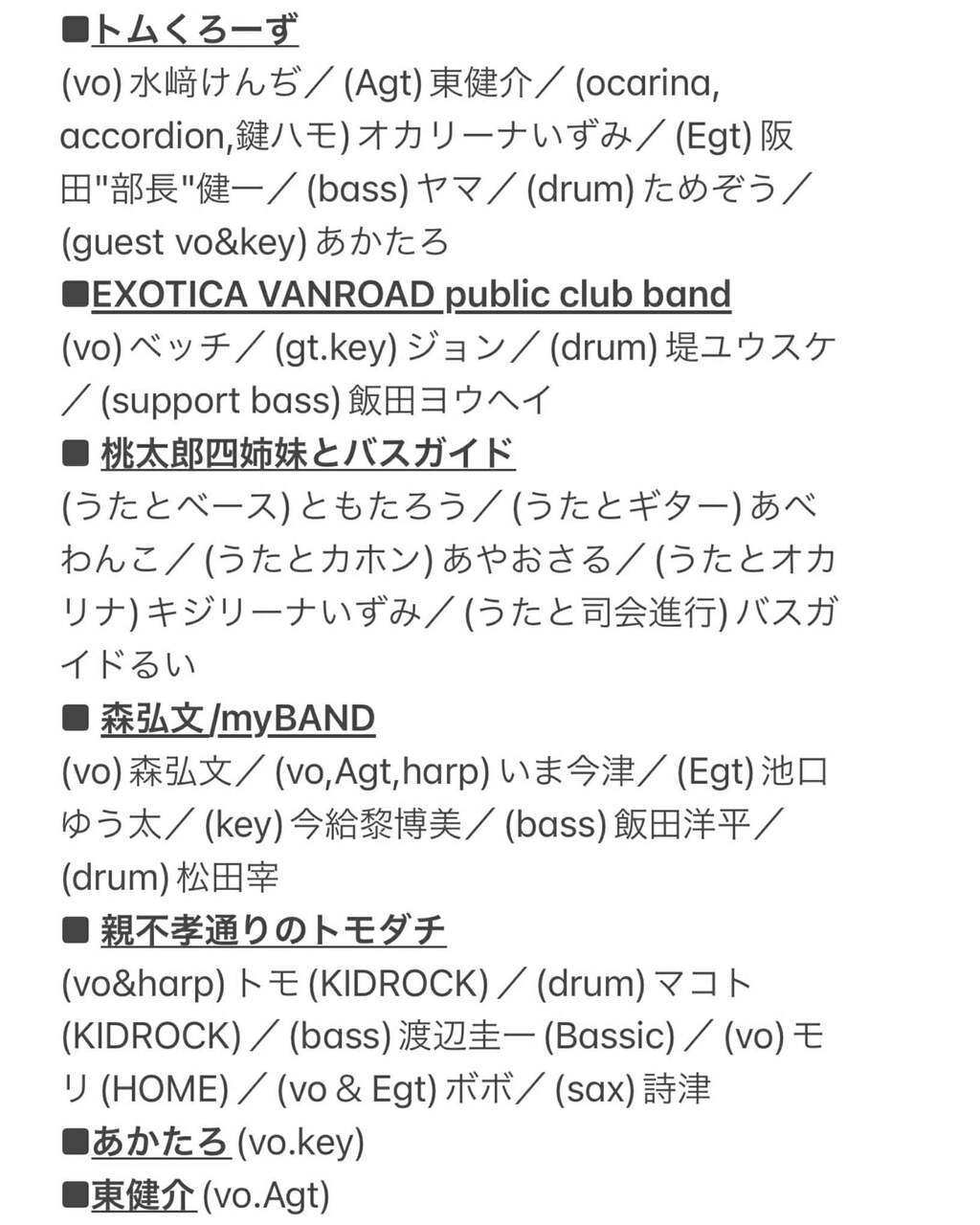 - 出 演 : トムくろーず, Guest:, Exotica Vanroad Public Club Band, 桃太郎四姉妹とバスガイド, 森弘文/myBAND, Opening Act:, 親不孝通りのトモダチ, あかたろ