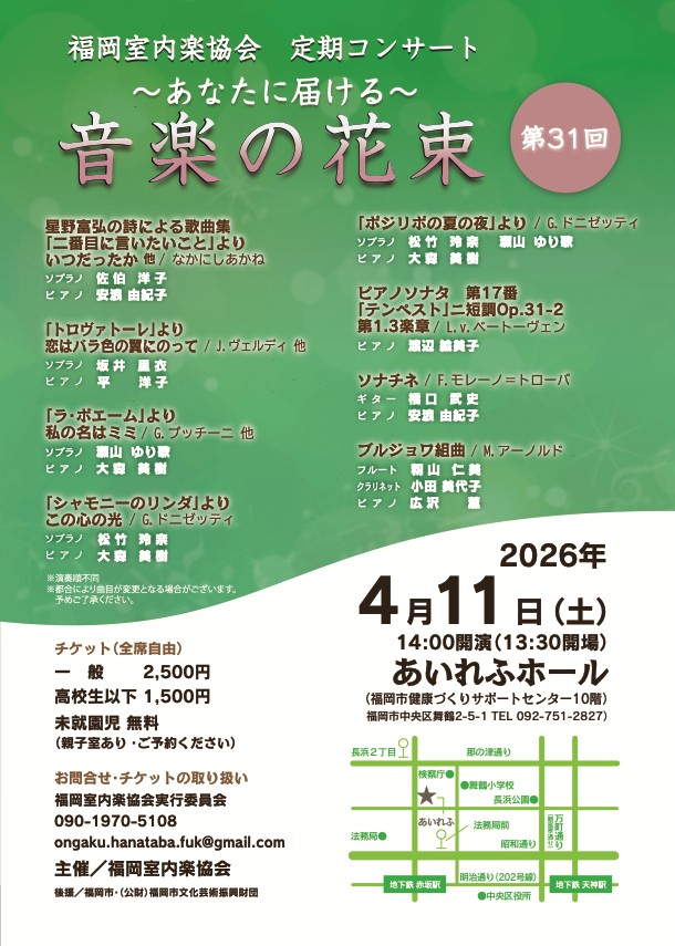 | イベント名 | 福岡室内学協会 定期コンサート ~あなたに届ける~ 音楽の花束 第31回 |
