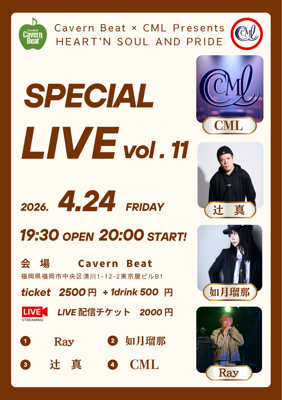 | イベント名 | Cavern Beat × CML Presents ” HEART’N SOUL AND PRIDE ” SPECIAL LIVE vol.11 |