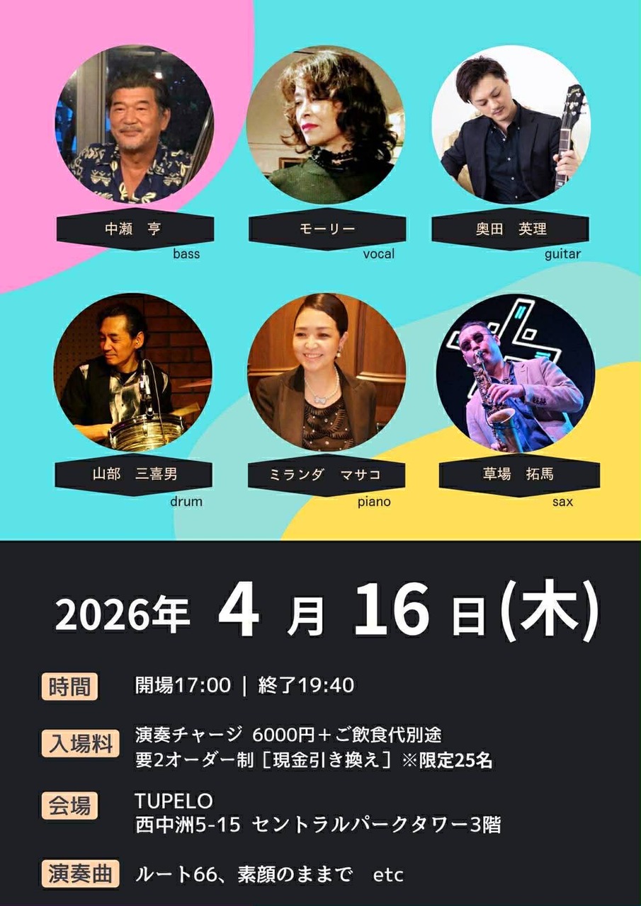| 出演者 | モーリー(vo.) 中瀬亨(b.) 奥田英理(g.) ミランダマサコ(pf.) 山部三喜男(dr.) 草場拓馬(sax.) |