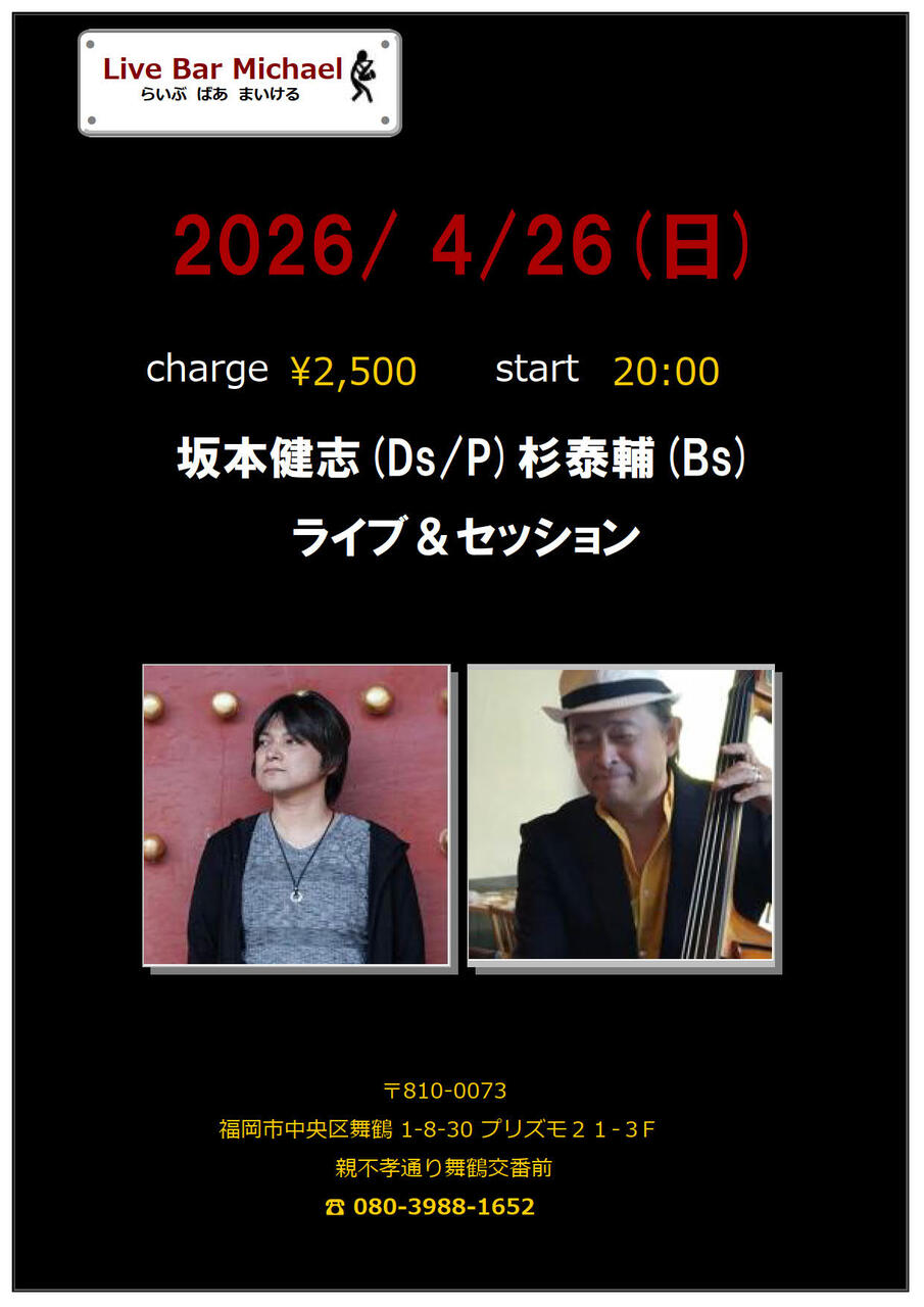 坂本健志(Ds/P)杉泰輔(Bs)ライブ&セッション2500円20:00スタート