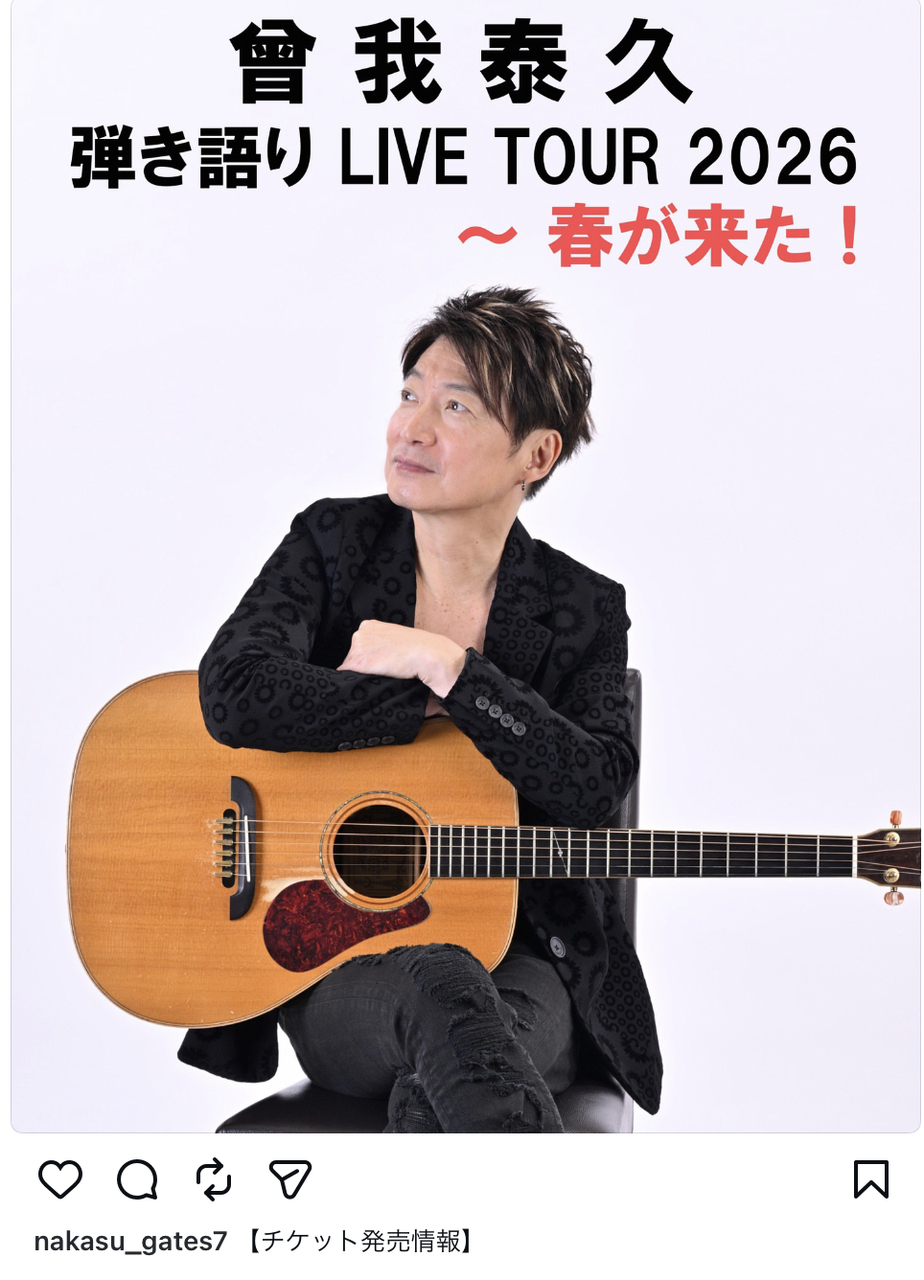 | イベント名 | 曾我 泰久 弾き語り LIVE TOUR 2026 ~ 春が来た! 2026年の春は曾我泰久の弾き語りによるソロライヴで各地にうかがいます! |