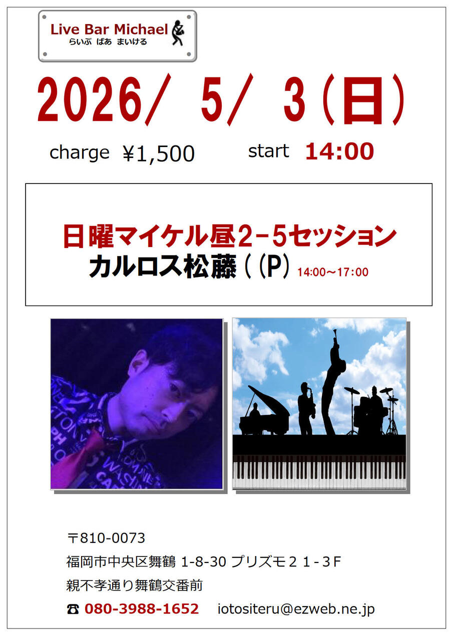 - 出 演 : 日曜マイケル昼2-5セッション カルロス松藤((P)1500円14:00~17:00