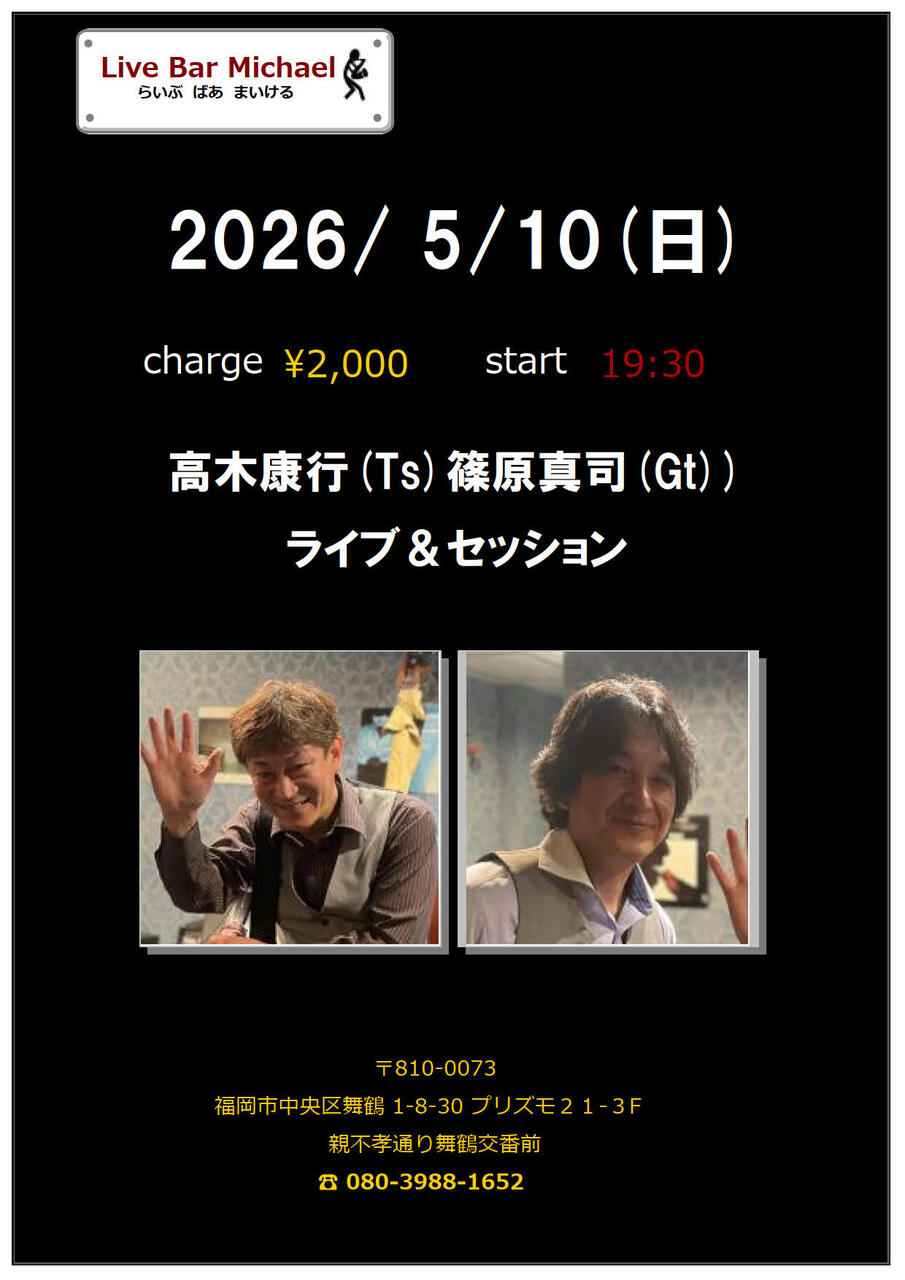 | 出演者 | 高木康行(Ts)篠原真司(Gt)ライブ&セッション2000円19:30スタート |