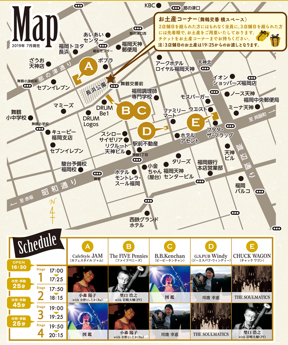 5つの参加店を1枚のチケットで出入り自由!(入店毎に要1ドリンクオーダー) CafeStyle JAM(カフェスタイル ジャム) / The FIVE Pennies(ファイブペニーズ) / B.B.Kenchan(ビービーケンチャン) / G.S.PUB Windy(ジーエスパブ・ウィンディー) / CHUCK WAGON(チャックワゴン) |