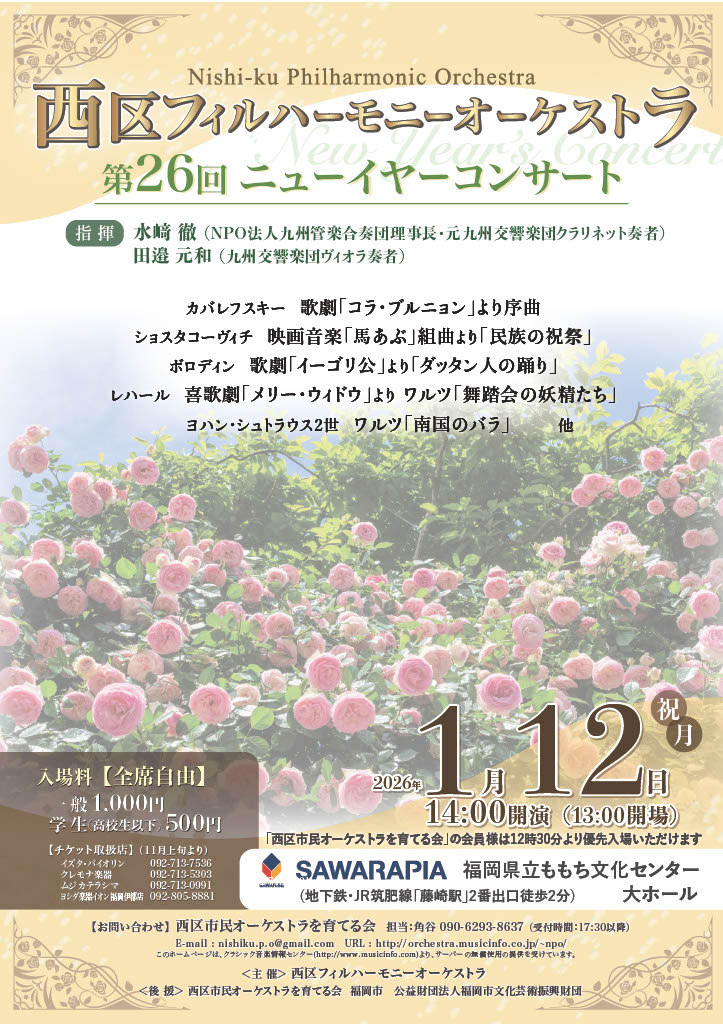 | 備考 | ◆Program 歌劇「コラ・ブルニョン」より序曲 映画音楽「馬あぶ」組曲より「民族の祝祭」 歌劇「イーゴリ公」より「ダッタン人の踊り」 喜歌劇「メリー•ウィドウ」よりワルツ「舞踏会の妖精たち」 ワルツ「南国のバラ」他 ◆お問い合わせ 西区市民オーケストラを育てる会(担当:角谷) ☎090-6293-8637(17:30〜) ◆主催:西区フィルハーモニーオーケストラ 後援:西区市民オーケストラを育てる会、福岡市、(公財)福岡市文化芸術振興財団 ◆チケット取り扱い 11月上旬より ①イズタバイオリン 092-713-7536 ②クレモナ楽器 092-713-5303 ③ムジカテラシマ 092-713-0991 ④ヨシダ楽器イオン伊都店 092-805-8881 |