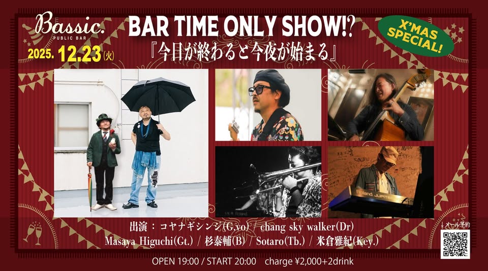 | 備考 | マンスリーでやっていただいてるコヤナギシンジの "Bar time only show!?" 2025年ラストはX'masスペシャルでお届けします! ぜひ気軽にお酒と共に愉しんでください♪ ゲスト全員のリストは主催者の要請により非表示になっています。 |