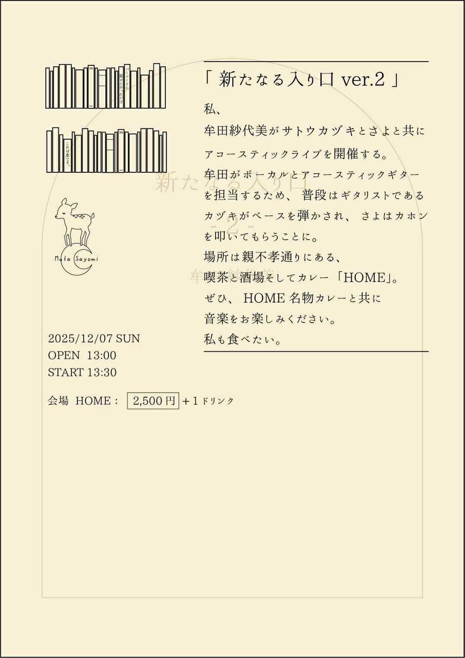 | イベント名 | 新たなる入り口ver.2-牟田紗代美ワンマンライブ- |