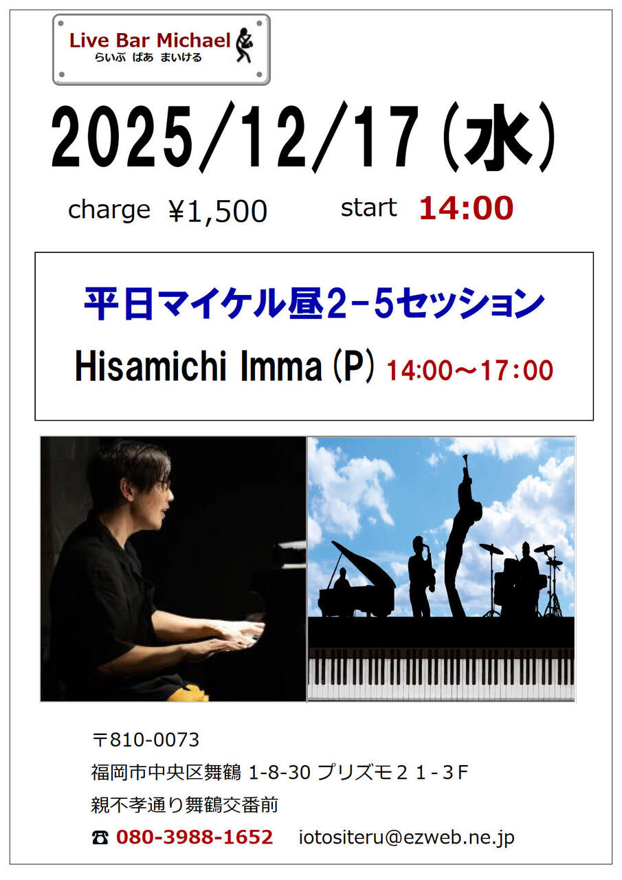 平日マイケル昼2-5セッション Hisamichi Imma(P)1500円14:00~17:00
