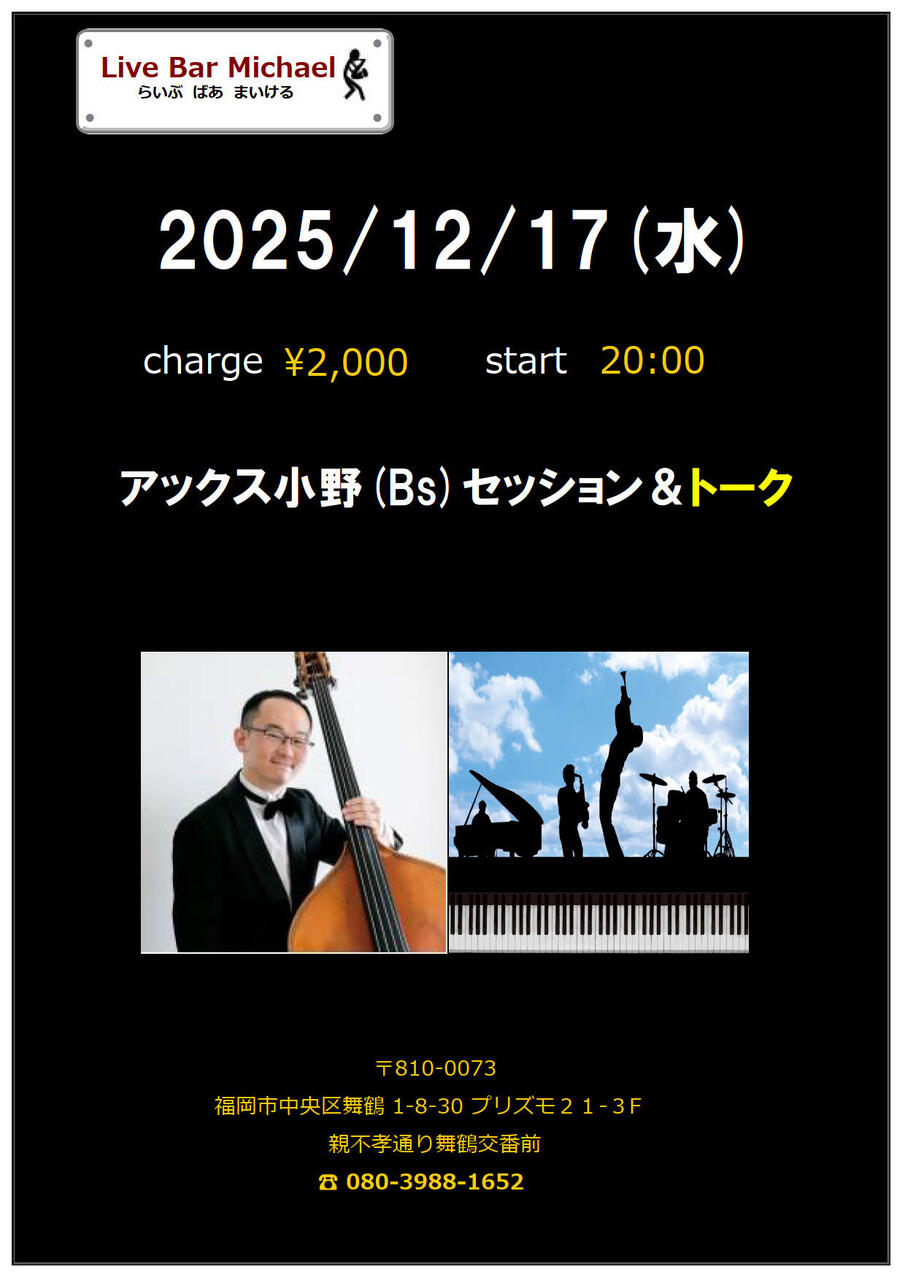 - 出 演 : アックス小野(Bs)セッション&トーク2000円20:00スタート