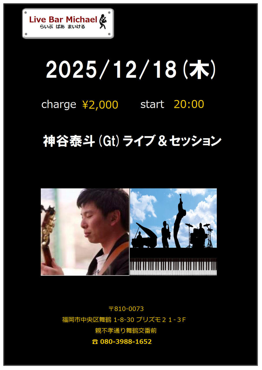 | 出演者 | 神谷泰斗(Gt)ライブ&セッション2000円20:00スタート |