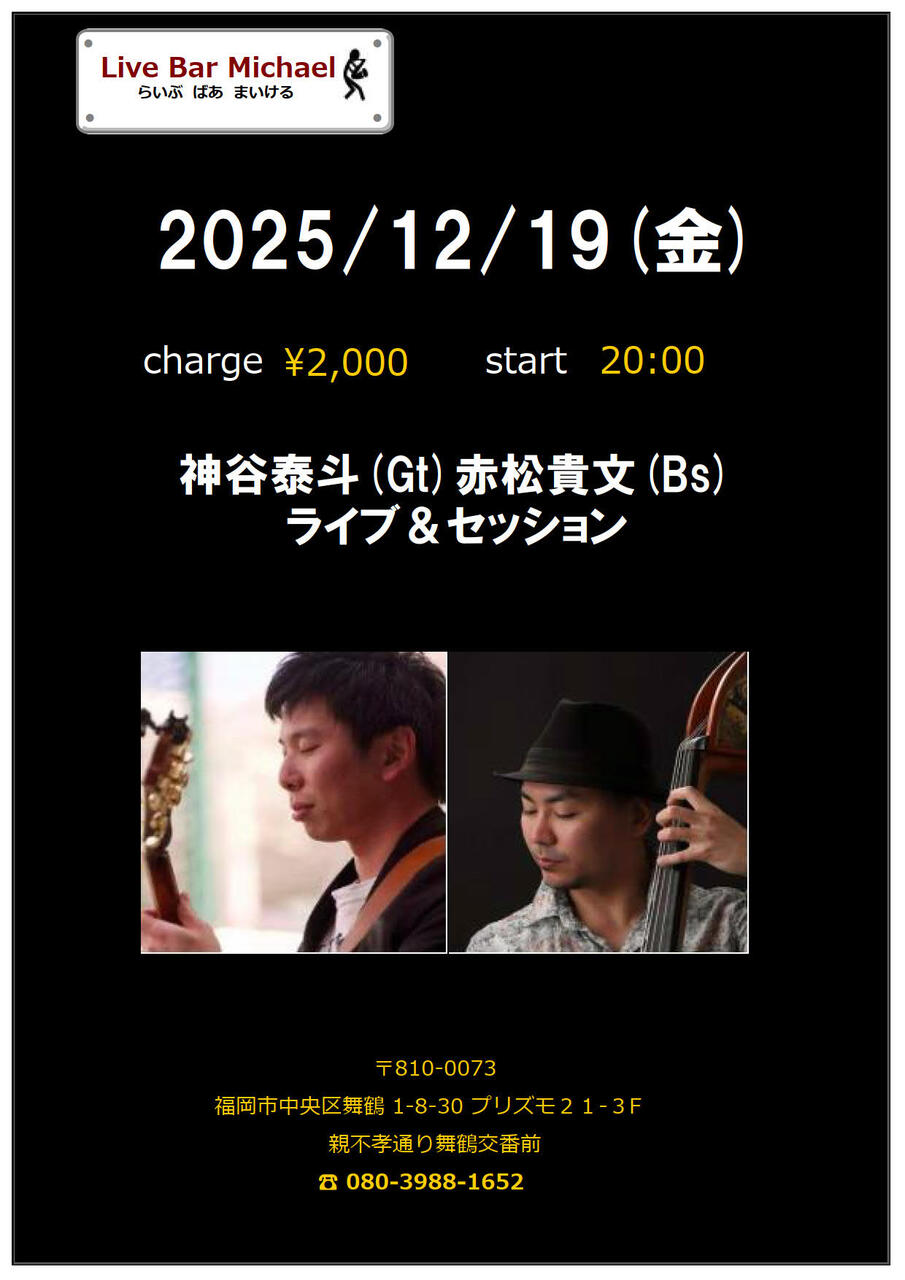 | 出演者 | 神谷泰斗(Gt)赤松貴文(Bs)ライブ&セッション2000円20:00タート |