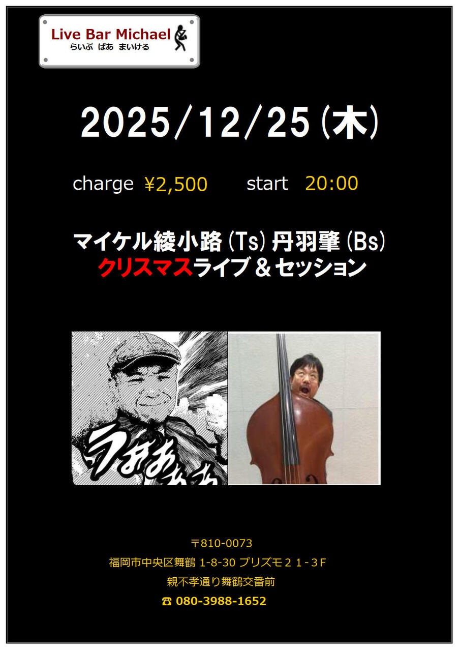 | イベント名 | マイケル綾小路(Ts)丹羽肇(Bs)クリスマスライブ&セッション2000円20:00スタート |