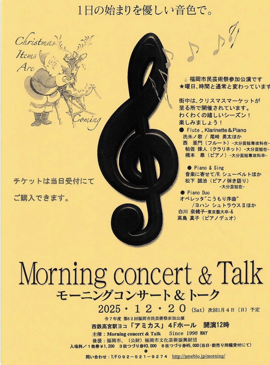 - 出 演 : 西 亜門(フルート)、帖佐 煉人(クラリネット)&橋本 皐(ピアノ)松下誠治、白川 奈緒子&高島 真子(ピアノデュオ)
