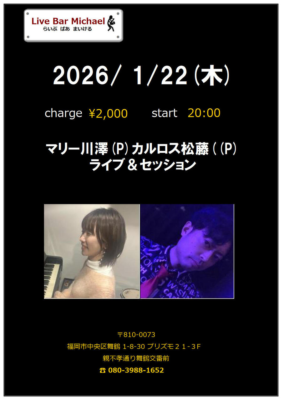 - 出 演 : マリー川澤(P)カルロス松藤((P)ライブ&セッション2000円20:00スタート