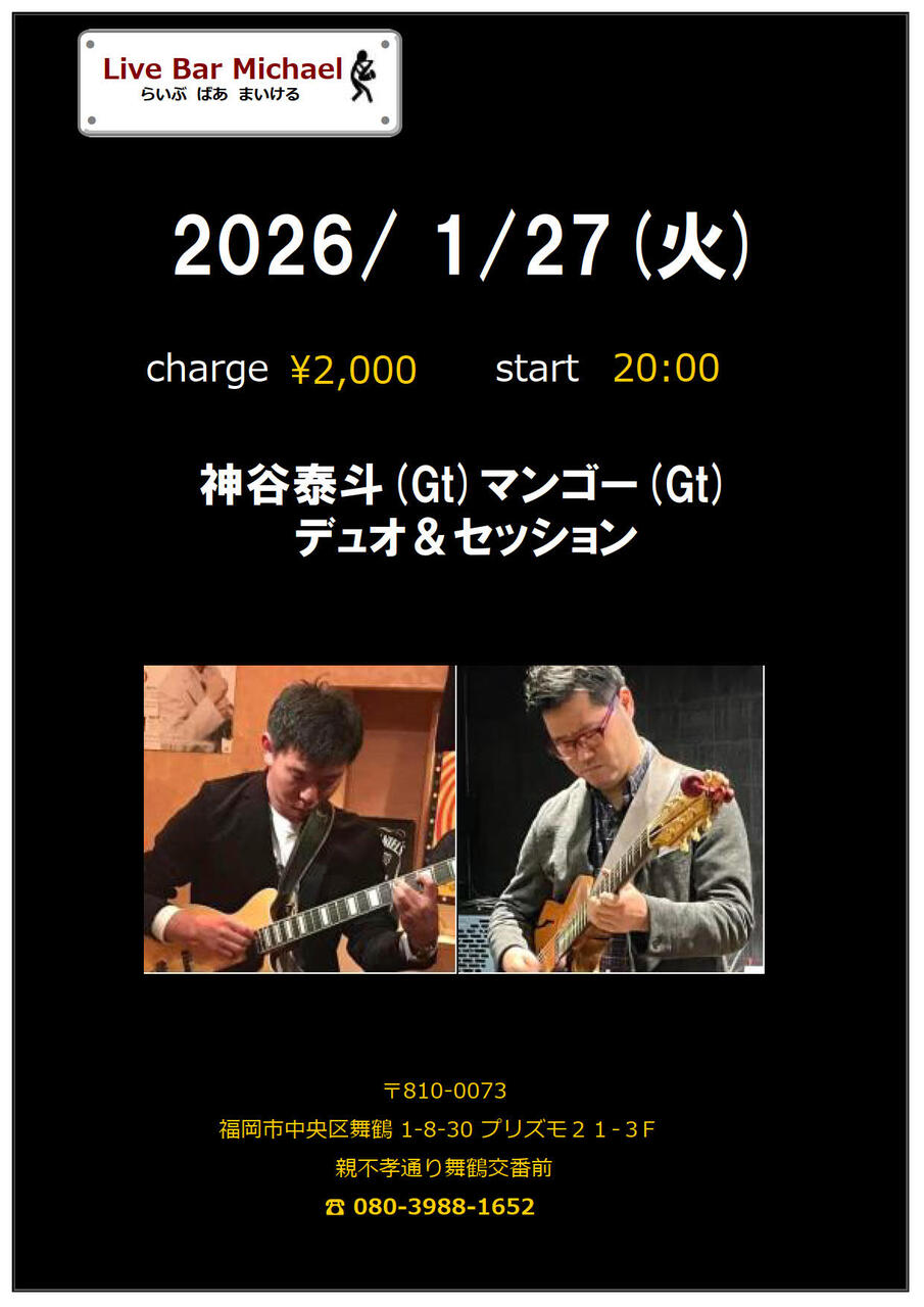 | 出演者 | 神谷泰斗(Gt)マンゴー(Gt)ライブ&セッション2000円20:00スタート |