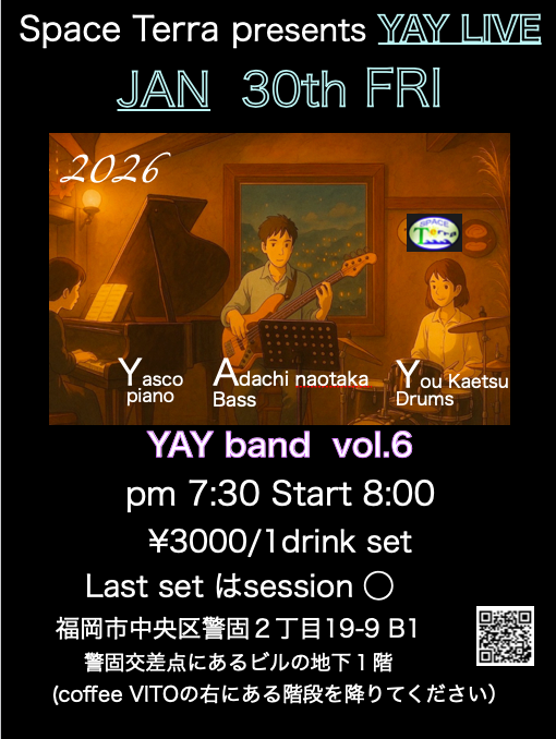| 出演者 | Yasco:Piano Adachi N:Bass YOU Kaetsu:Drums |