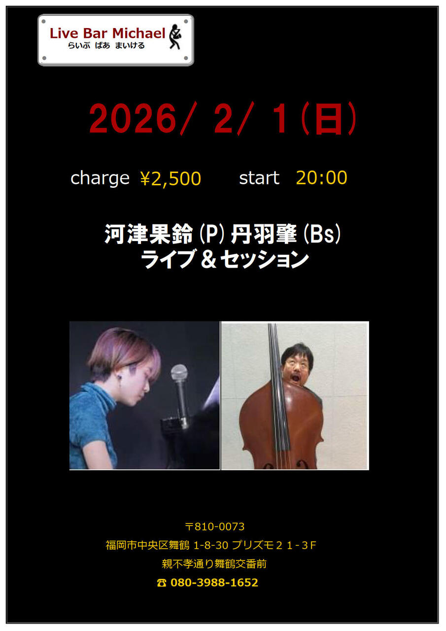 - 出 演 : 河津果鈴(P)丹羽肇(Bs)ライブ&セッション2500円20:00スタート