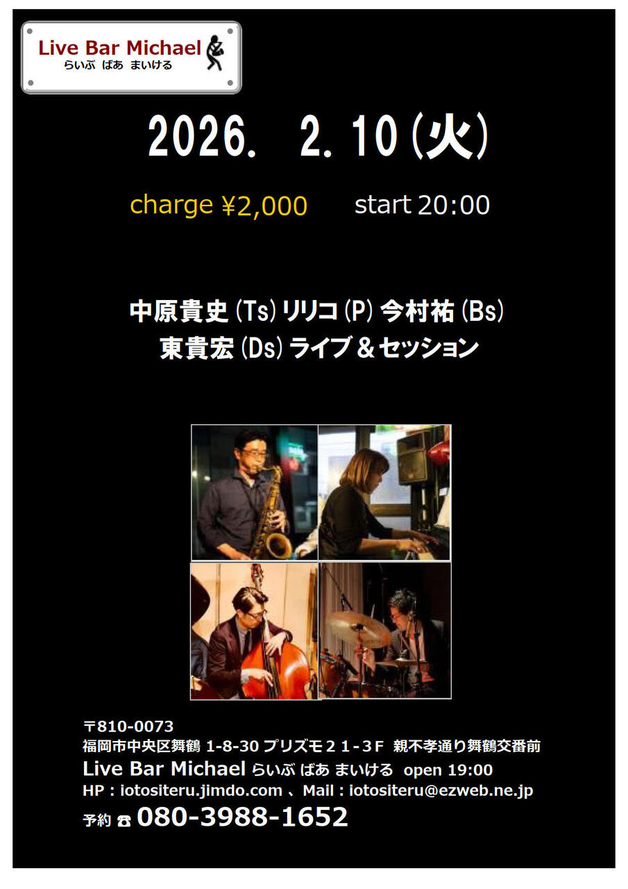 | 出演者 | 中原貴史(Ts)リリコ(P)今村祐(Bs)東貴宏(Ds)ライブ&セッション2000円20:00スタート |