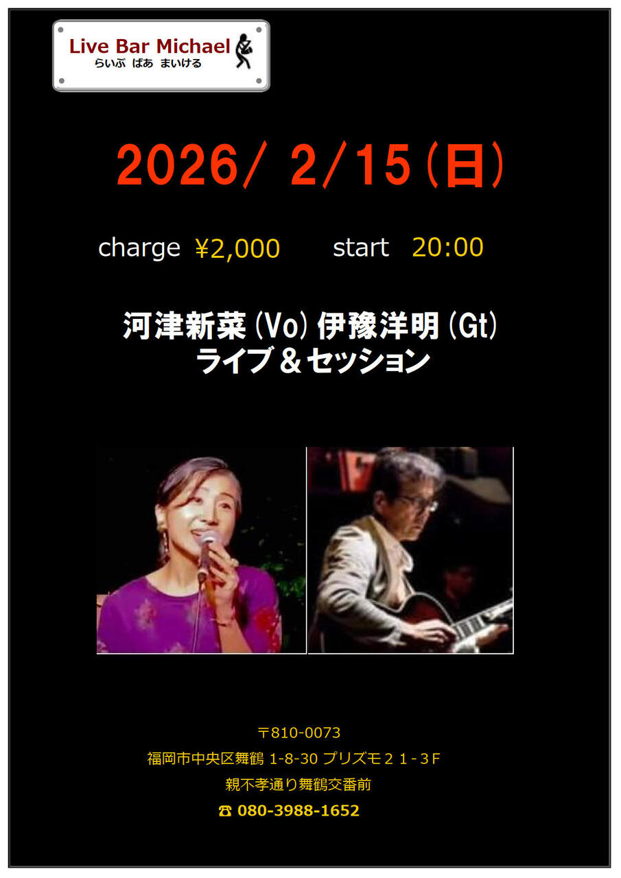| 出演者 | 河津新菜(Vo)伊豫洋明(Gt)ライブ&セッション2000円20:00スタート |