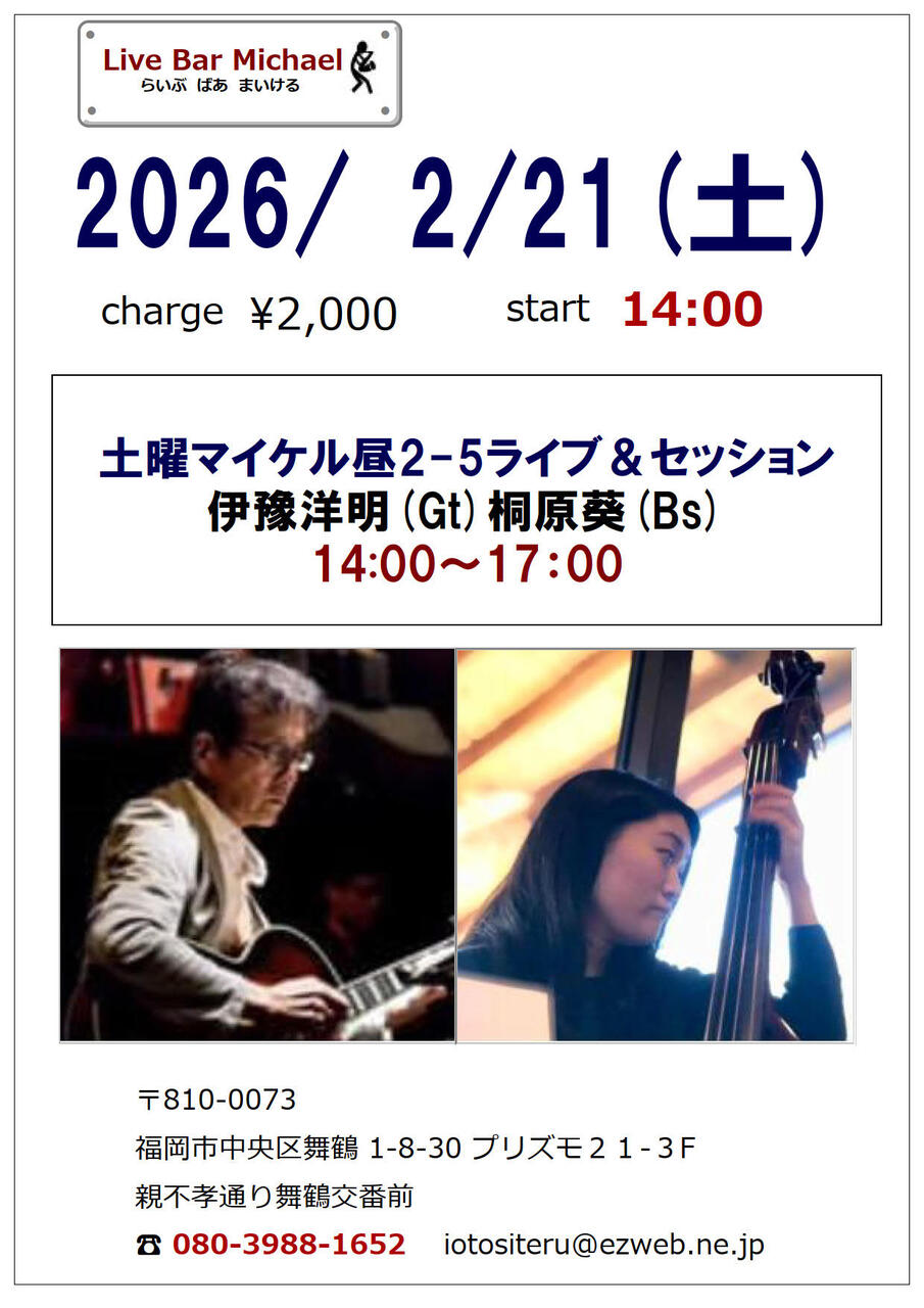 | 出演者 | 土曜マイケル昼2-5セッション伊豫洋明(Gt)桐原葵(Bs)2000円14:00~17:00 |